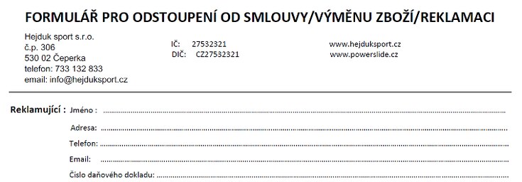 Reklamace zboží na e-shopu www.powerslide.cz. V případě závady na zakoupeném zboží, má každý zákazník právo na reklamaci daného výrobku. Zboží zašlete spolu s reklamačním formulářem na naši provozovnu, kde bude předána/zaslána k posouzení. Vaši reklamaci se budeme snažit vyřídit co nejrychleji.